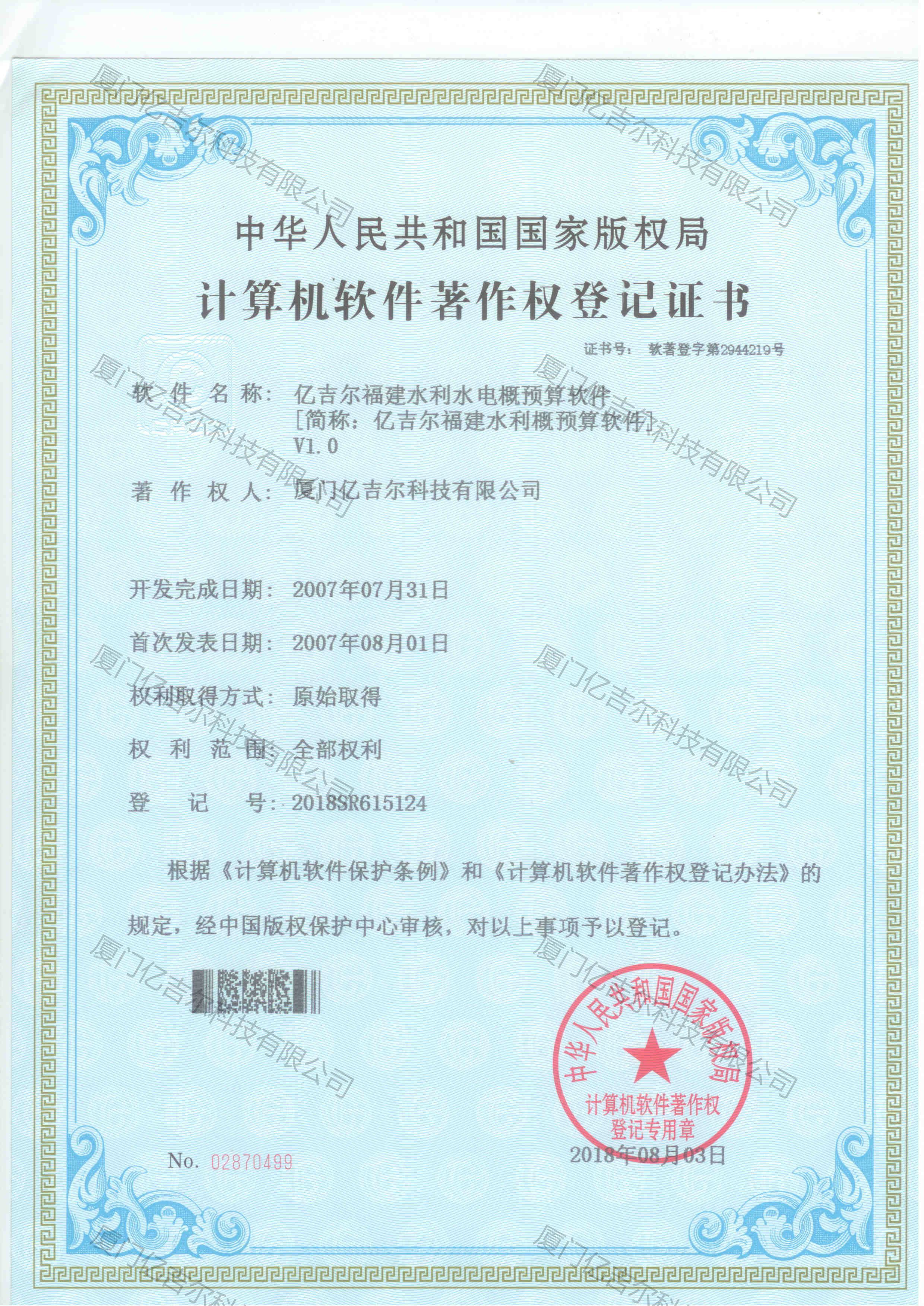 億吉爾福建水利水電概預(yù)算軟件著作權(quán)登記證書 發(fā)布日期:2018年08月03日 瀏覽次數(shù):4182 關(guān)鍵字: 公司 1/1億吉爾福建水利水電概預(yù)算軟件著作權(quán)登記證書