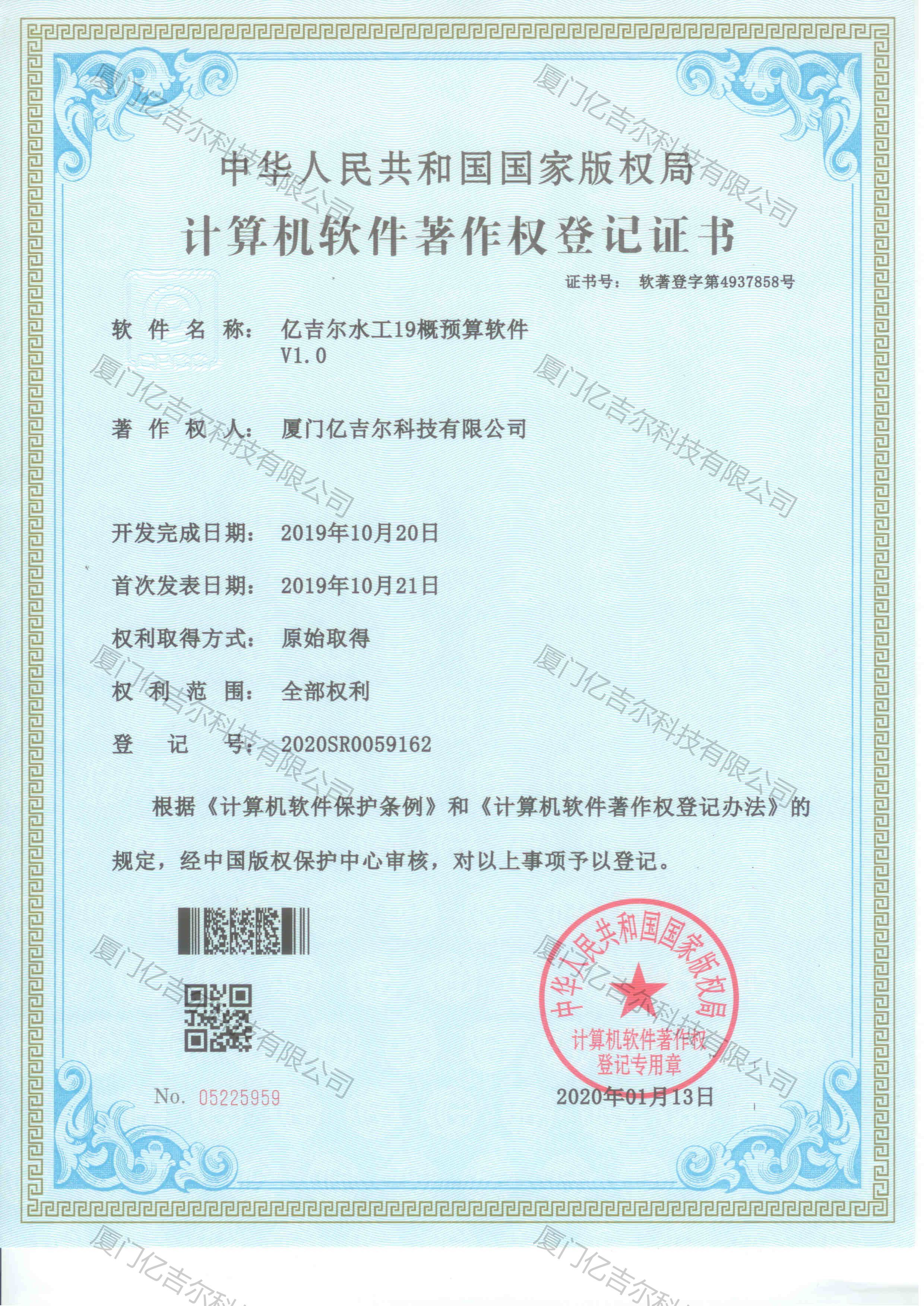 億吉爾水工19概預(yù)算軟件著作權(quán)登記證書 發(fā)布日期:2020年01月13日 瀏覽次數(shù):4764 關(guān)鍵字: 公司 1/1億吉爾水工19概預(yù)算軟件著作權(quán)登記證書
